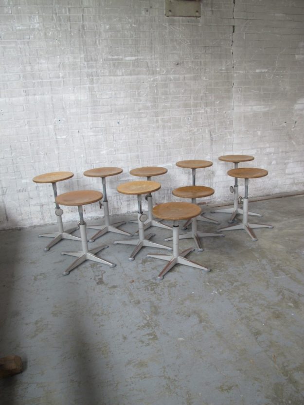 Tien Industriële teken school krukken Ahrend Friso Kramer. Krukken zijn draaibaar op kruispoot en 35 tot 60 cm hoog. Krukken verkeren in een goede vintage staat.