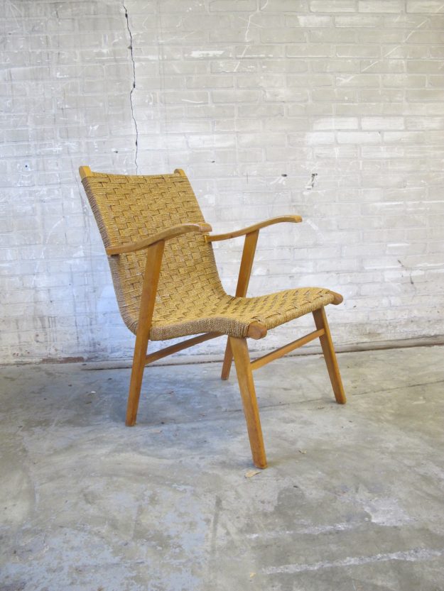 Vroom & Dreesman Bas van der Pelt stijl houten fauteuil jaren 60. Dames model met mooie organische vormen in touw gevlochten. Fauteuil verkeert nog in een zeer goede vintage staat.