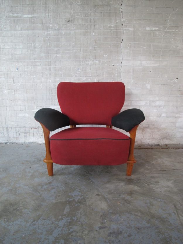 Schitterende lounge fauteuil F109 Theo Ruht voor Artifort model uit jaren 50. Mooi organisch model met een mooie rood zwarte stoffen bekleding. Fauteuil verkeert nog in een zeer goede vintage staat.